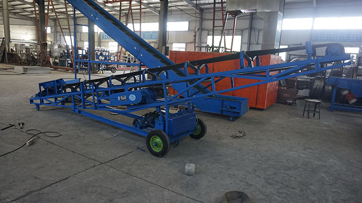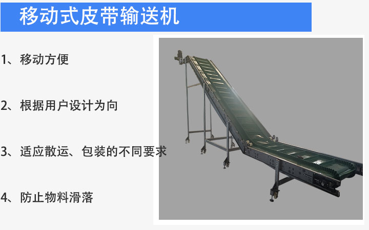 移動式皮帶輸送機是在普通皮帶輸送機底部加裝了移動輪、充氣輪胎、滑動輪,可以根據(jù)物料的堆放位置隨意移動,人工即可推動出入倉庫,主要用于裝卸地方變動的場合。
